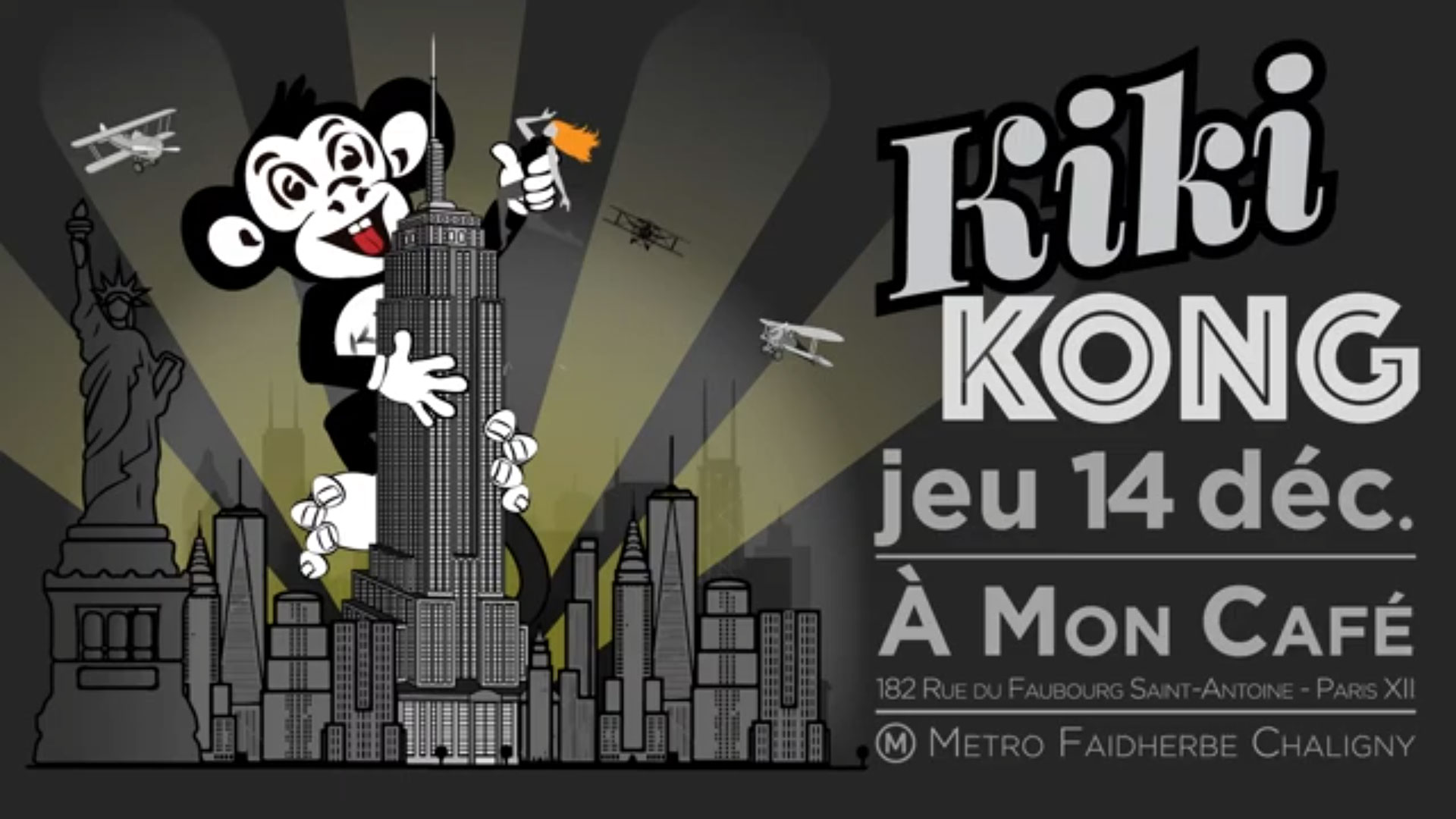 Afterwork - Kiki King Jeudi 14 décembreKiki dans sa jungle rencontre une photographe New-Yorkaise. Il a trouvé une nouvelle amie ! Il part pour New York à sa recherche Une course folle commence !... Jeudi 14 Décembre infos: https://www.facebook.com/events/118331642268911/